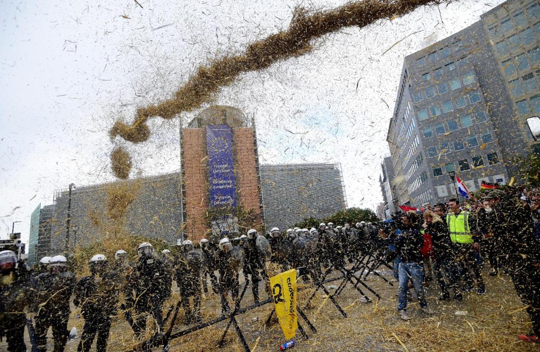 Los manifestantes usaron tractores para bloquear el centro de la ciudad y se enfrentaron a los policías, a quienes les arrojaron paja y otros objetos.