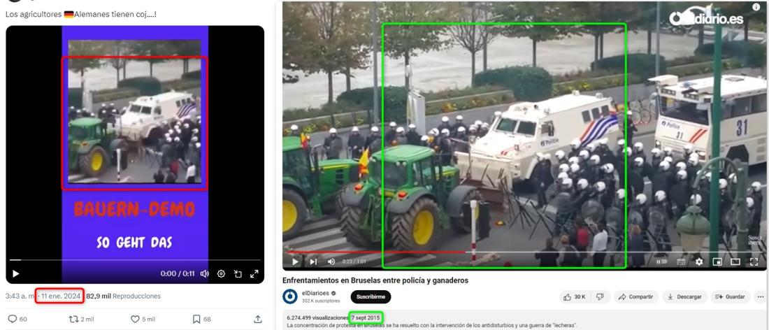 De acuerdo con el título de la secuencia, que dura un minuto, se trata de “Enfrentamientos en Bruselas entre policía y ganaderos”. A partir del segundo 00:22 se puede observar el mismo instante que se muestra en la primera parte del video viralizado.