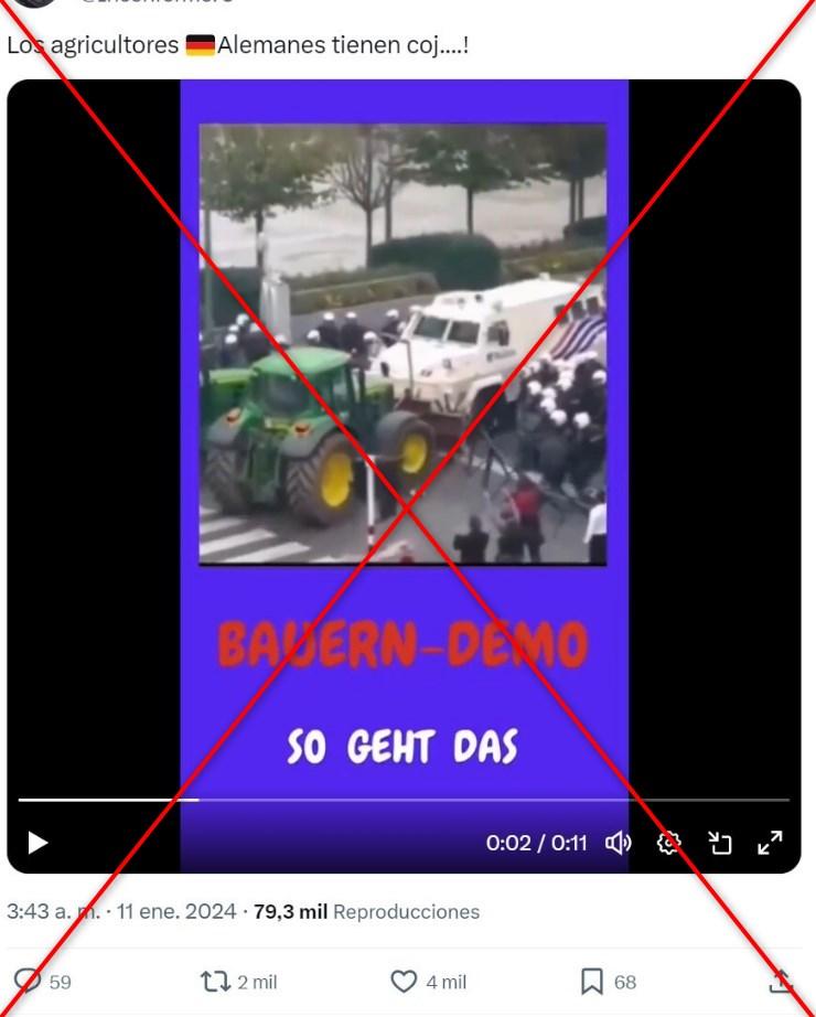 La secuencia, que también se ha difundido en TikTok, incluye una leyenda en alemán que dice “Bauern-demo. So geht das”, en español: “protesta de agricultores así es como funciona”.