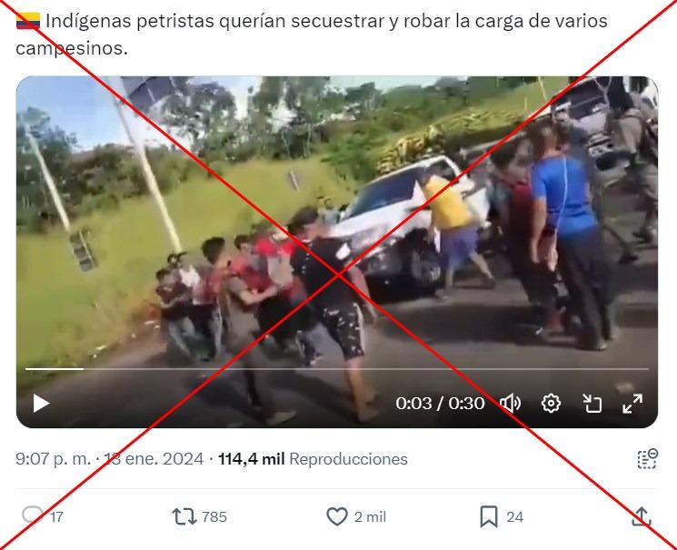 “Indígenas petristas querían secuestrar y robar la carga de varios campesinos” y “Qué le pasa a los indígenas anclados en las vías del [departamento colombiano de] Chocó”, señalan entradas en X y Facebook (1, 2).