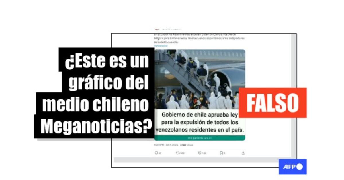 “Gobierno de chile aprueba ley para la expulsión de todos los venezolanos residentes en el país”, dice la supuesta placa de Meganoticias difundida en Facebook, Instagram, TikTok y X (1, 2).