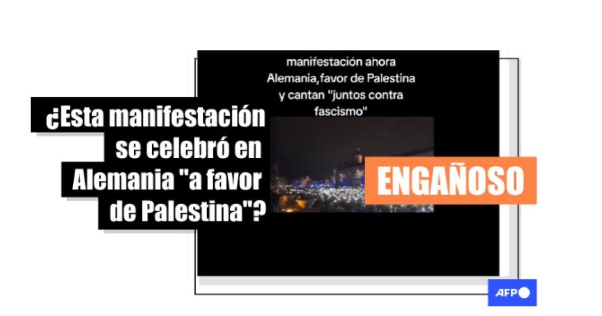 “Alemania también sale a la calle a favor de Palestina alzando la voz en contra del fascismo”, señala una publicación en X, con el vídeo de una manifestación en la que los asistentes alzan sus teléfonos móviles y gritan consignas como “todos juntos contra el fascismo” en alemán. Sobreimpreso en las imágenes se lee: “Manifestación ahora Alemania, favor de Palestina y cantan juntos contra el fascismo”.