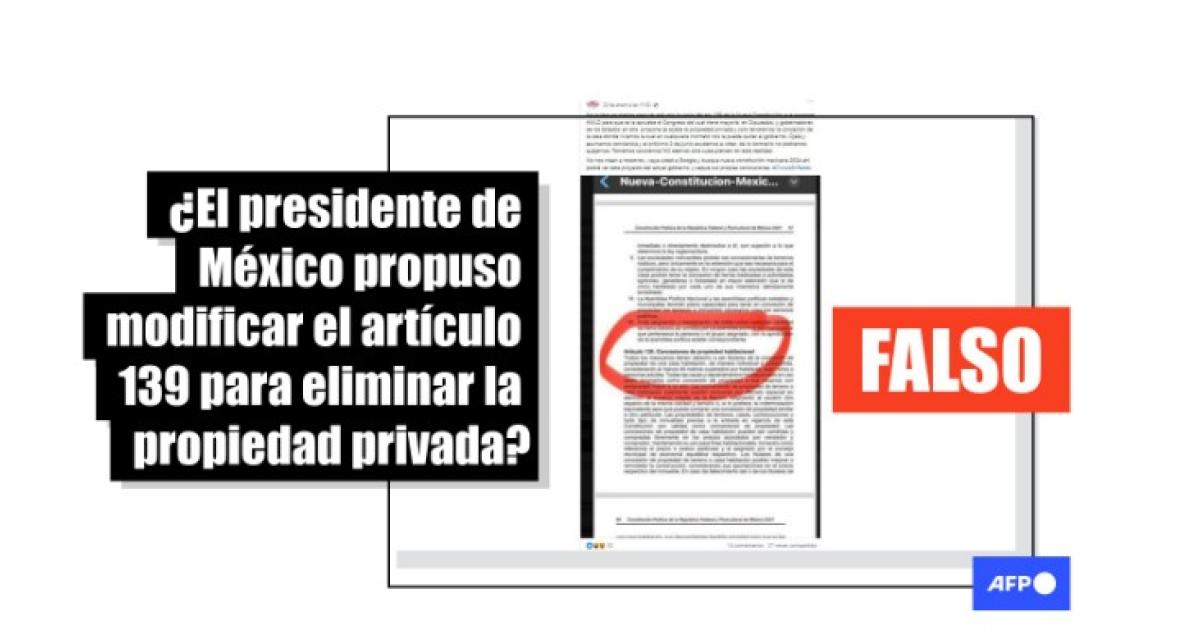 “No quiero asustarlos pero les adjunto la copia del art. 139 de la Nueva Constitución que propone AMLO para que se la apruebe el Congreso del cual tiene mayoría tanto en Diputados, Senadores y gobernadores de los Estados, donde propone se acabe la *propiedad privada*”, señalan publicaciones en Facebook (1, 2), que aseguran también que la legislación permitirá al gobierno expropiar viviendas.