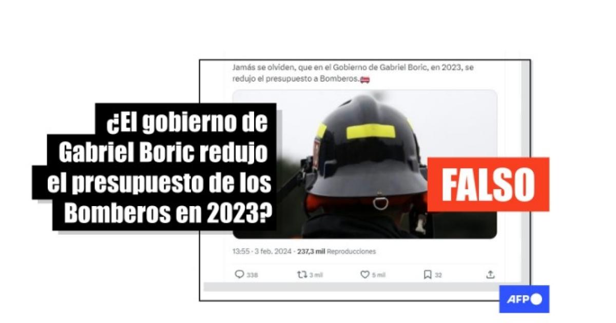 “Jamás se olviden, que en el gobierno de Gabriel Boric, en 2023, se redujo el presupuesto a Bomberos”, se lee en publicaciones que circulan en X y Facebook.