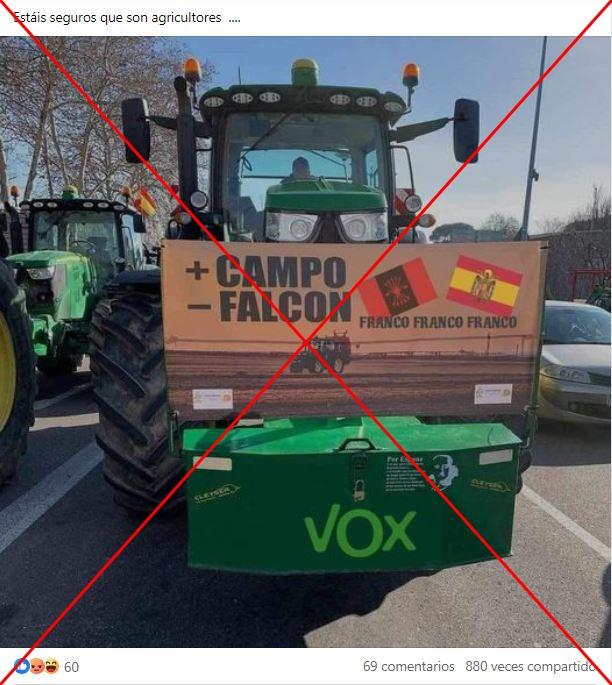 Miles de agricultores protestan desde principios de 2024 contra las normas de producción en la Unión Europea y la pérdida de competitividad de sus productos frente a las importaciones. Las manifestaciones también llegaron a España en febrero. En ese contexto, usuarios de redes sociales han compartido más de 1.000 veces la imagen de un tractor con un cartel de la bandera franquista, referencias al dictador Francisco Franco y el logotipo del partido político Vox. La imagen, sin embargo, fue manipulada.
