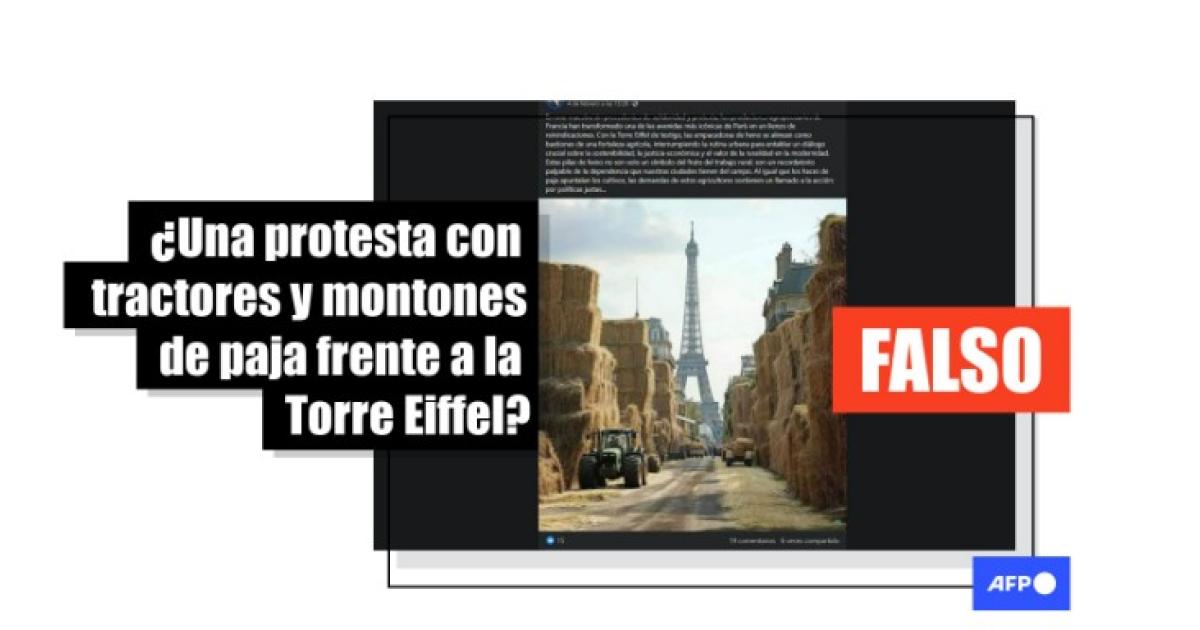 “En una muestra sin precedentes de solidaridad y protesta, los productores agropecuarios de Francia han transformado una de las avenidas más icónicas de París en un lienzo de reivindicaciones. Con la Torre Eiffel de testigo, las empacadoras de heno se alinean como bastiones de una fortaleza agrícola (...)”, afirma una de las publicaciones que difunden la imagen en Facebook (1, 2) y X.