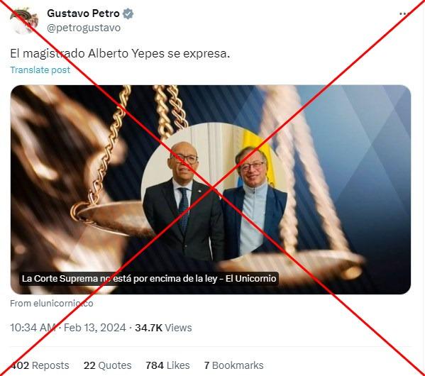 Un texto que cuestiona el retraso de la Corte Suprema de Justicia de Colombia para elegir un nuevo fiscal general no fue escrito por el exmagistrado del Consejo de Estado Alberto Yepes Barreiro, contrario a lo que aseguró el presidente, Gustavo Petro, en su cuenta en X, y varios usuarios que compartieron el escrito más de 35.000 veces en redes sociales desde el 13 de febrero de 2024. En realidad, la columna de opinión es de un homónimo, Alberto Yepes Palacio, que no tiene relación con ningún alto tribunal.