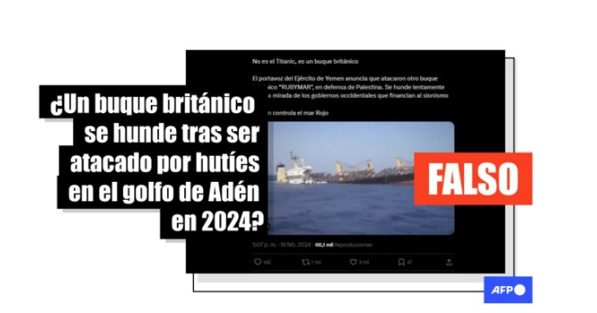 “No es el Titanic, es un buque británico El portavoz del Ejército de Yemen anuncia que atacaron otro buque británico ‘RUBYMAR’, en defensa de Palestina. Se hunde lentamente ante la mirada de los gobiernos occidentales que financian al sionismo”, afirma una de las entradas que difunden el video en Facebook (1, 2) y X (1, 2).
