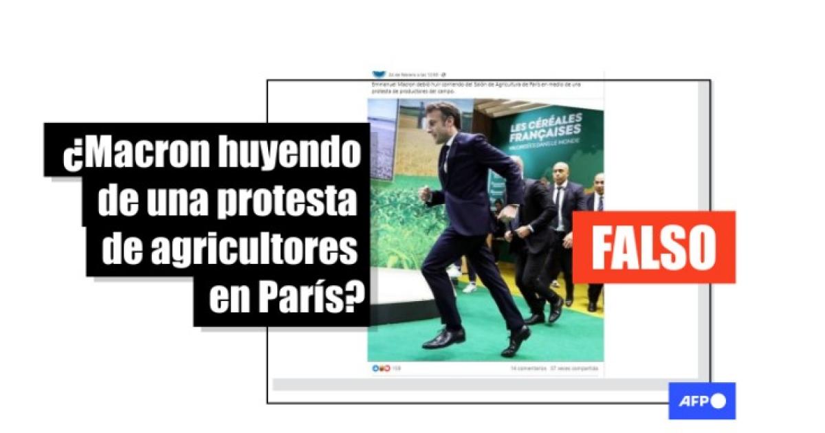 “El Presidente Francés Emmanuel Macron huye corriendo de La Rural parisina en medio de una protesta de agricultores. El presidente francés debió escapar del Salón de la Agricultura en París”, aseguran publicaciones compartidas en Facebook (1, 2) y X.