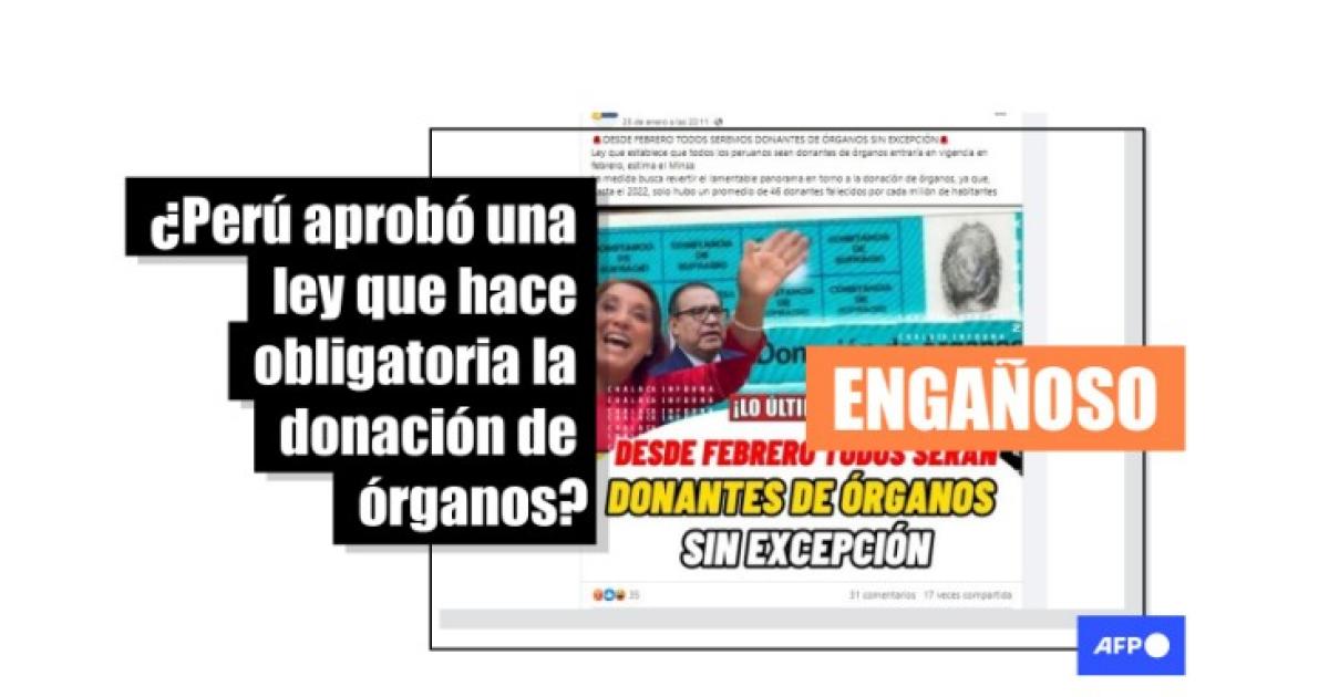 La Ley Nº 31756 promulgada en mayo de 2023 en Perú no obliga a los ciudadanos a ser donantes de órganos en caso de fallecimiento, a diferencia de lo que aseguran publicaciones compartidas más de 200 veces en redes sociales desde enero de 2024. En realidad, la normativa establece que todos los mayores de 18 años sean considerados como donantes, a menos que manifiesten que no desean serlo y lo hagan constar en su Documento Nacional de Identidad.