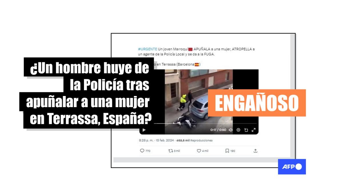 Un vídeo de un hombre que huye de la policía en la localidad catalana de Terrassa ha sido compartido más de 3.000 veces en redes sociales desde el 15 de febrero de 2024 con la afirmación de que es un migrante que escapa tras apuñalar a una mujer y arrollar a un oficial. Sin embargo, las autoridades locales aclararon a la AFP que el perseguido huyó de un control policial de circulación, pero no atacó a nadie. Así lo registraron varios medios de comunicación.