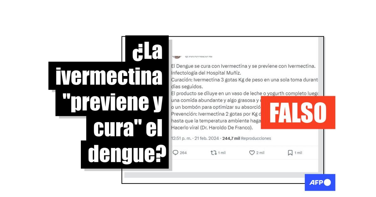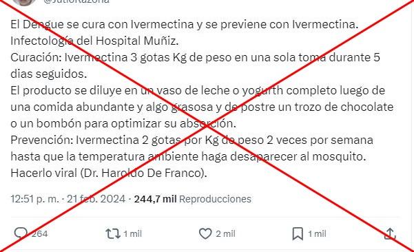 “El Dengue se cura con Ivermectina y se previene con Ivermectina”, se lee en una publicación en X en la que se detalla que el medicamento debe ser diluido “en un vaso de leche o yogurth completo luego de una comida abundante y algo grasosa (...) para optimizar su absorción”.