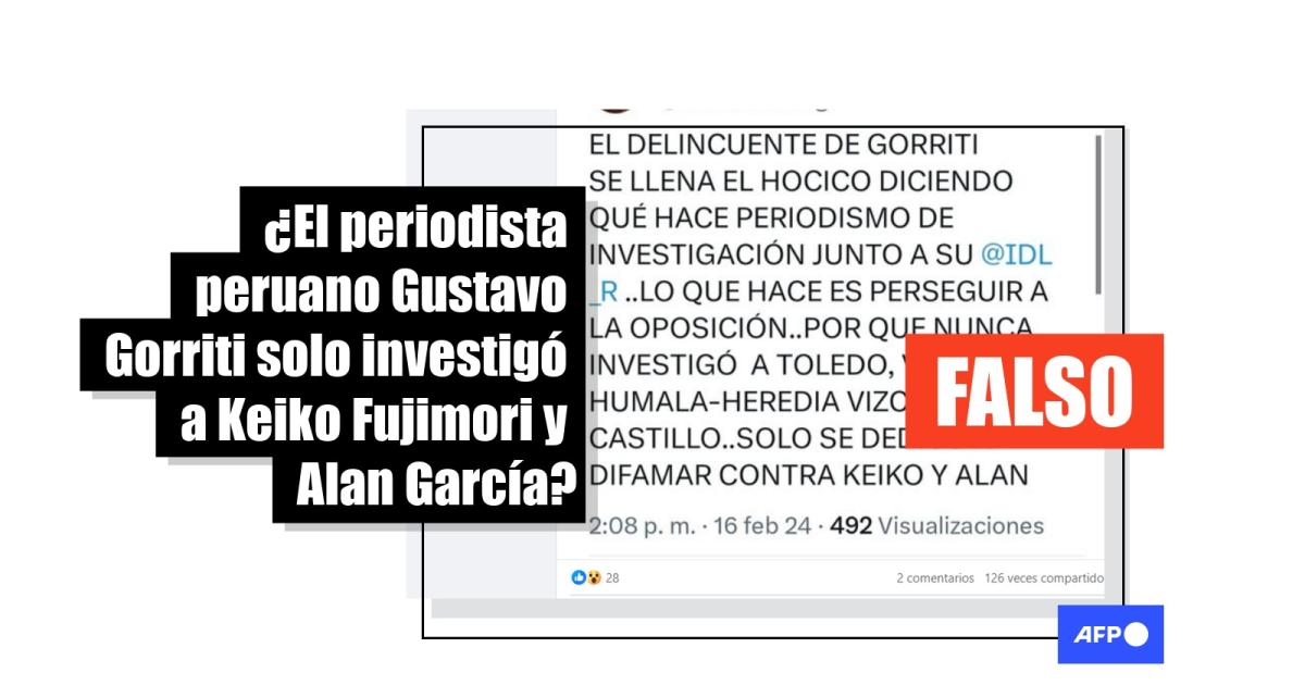 El periodista peruano Gustavo Gorriti, director de IDL Reporteros, es acusado por usuarios en redes sociales de “perseguir” a políticos como el expresidente Alan García y la excandidata Keiko Fujimori, y “nunca investigar” ni publicar notas contra otros como la exalcaldesa de Lima Susana Villarán o los exmandatarios Ollanta Humala, Martín Vizcarra, Francisco Sagasti y Pedro Castillo. Las entradas se han compartido cientos de veces desde febrero de 2024, pero lo que aseguran es falso: una búsqueda en el sitio web de su medio permitió encontrar diversos reportajes sobre los políticos mencionados.