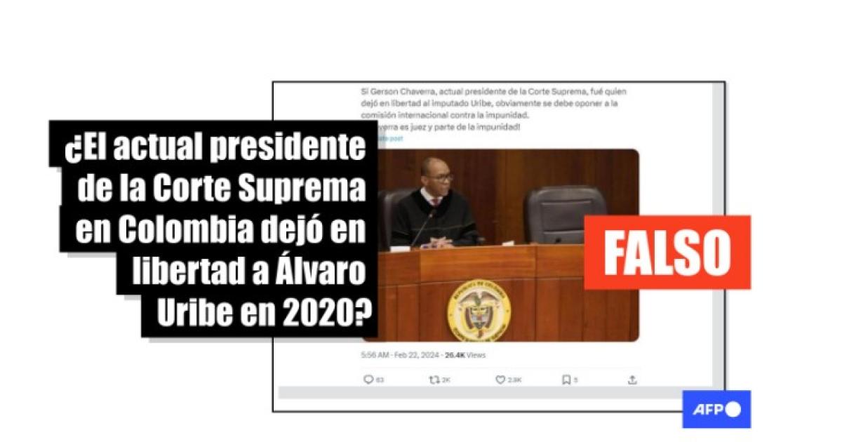 “Si Gerson Chaverra, actual presidente de la Corte Suprema, fué quien dejó en libertad al imputado Uribe, obviamente se debe oponer a la comisión internacional contra la impunidad. ¡Chaverra es juez y parte de la impunidad!”, dicen las publicaciones compartidas en Facebook (1, 2), X y TikTok.