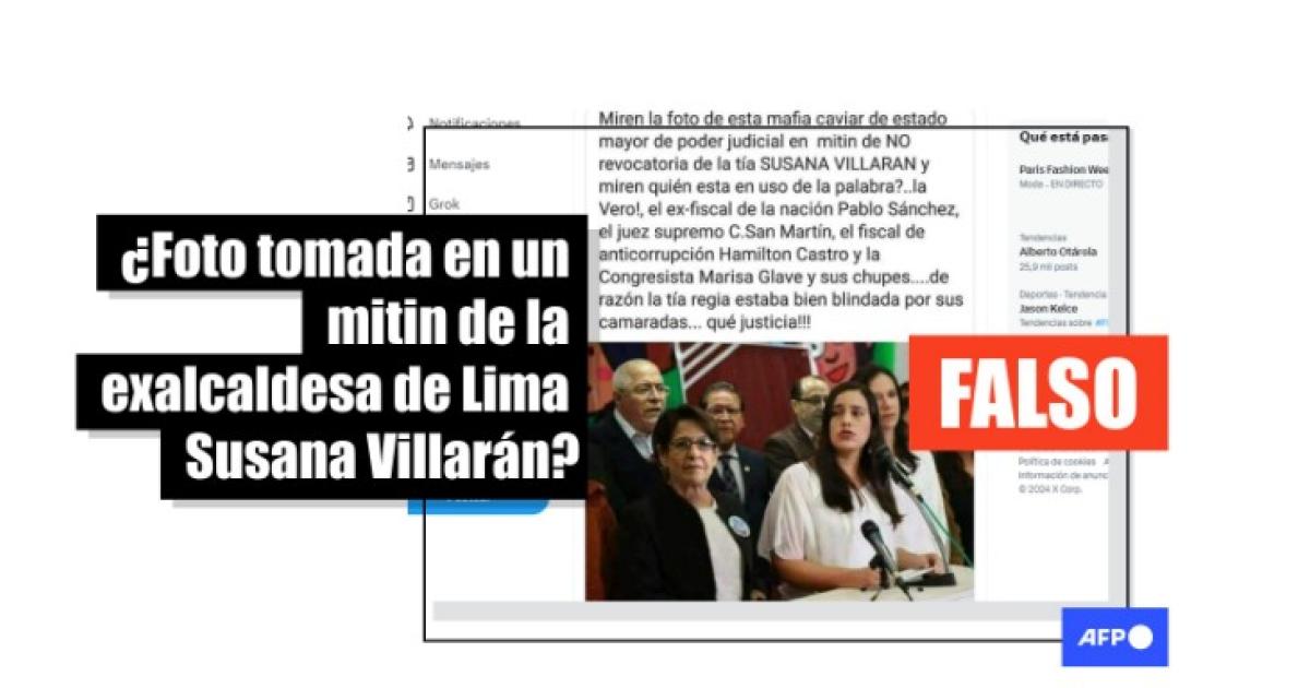 “Miren la foto de esta mafia caviar de estado mayor de poder judicial en mitin de NO [a la] revocatoria de la tía SUSANA VILLARÁN”, dice una imagen compartida más de 400 veces en X y en Facebook (1, 2, 3).