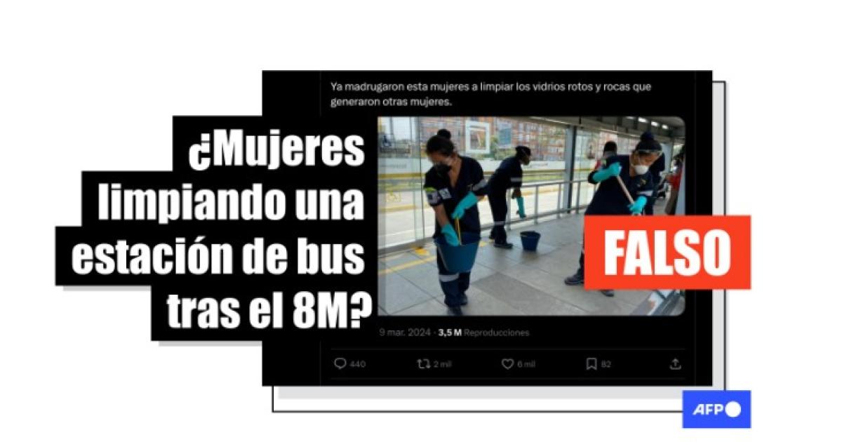 Foto de mujeres limpiando estación de bus se tomó en Bogotá en la pandemia, no tras marchas del 8M