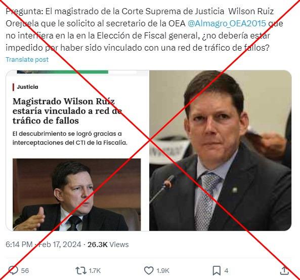 “Pregunta: El magistrado de la Corte Suprema de Justicia Wilson Ruiz Orejuela que le solicitó al secretario de la OEA @Almagro_OEA2015 que no interfiera en la en la Elección de Fiscal general, ¿no debería estar impedido por haber sido vinculado con una red de tráfico de fallos?”, dice una de las publicaciones compartidas en Facebook (1, 2) y X.