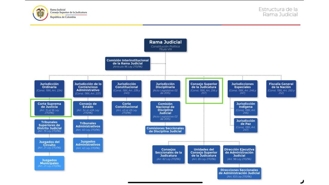 El Consejo Superior de la Judicatura, según su sitio web, se encarga de labores administrativas de la Rama Judicial, como “la reglamentación de la ley, la planeación, programación y ejecución del presupuesto y la administración del talento humano a través de la carrera judicial” entre otros aspectos.