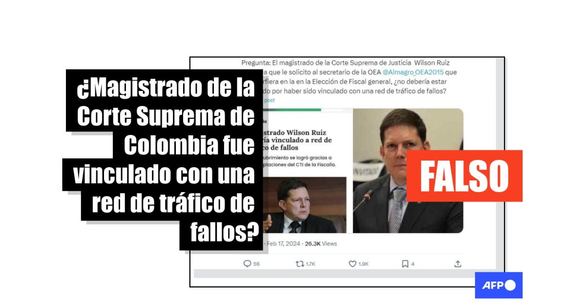 Mensajes difundidos en redes sociales afirman erróneamente que el abogado colombiano Wilson Ruiz es magistrado de la Corte Suprema de Justicia y que debió estar “impedido” para participar en la elección de la nueva fiscal general de la Nación, Luz Adriana Camargo. Las entradas, compartidas más de 1.500 veces desde el 17 de febrero de 2024, muestran un titular que vincula a Ruiz con un caso de “tráfico de fallos”. Pero la noticia es de 2013, cuando era magistrado del Consejo Superior de la Judicatura. Ruiz no ha estado vinculado a la Corte Suprema.