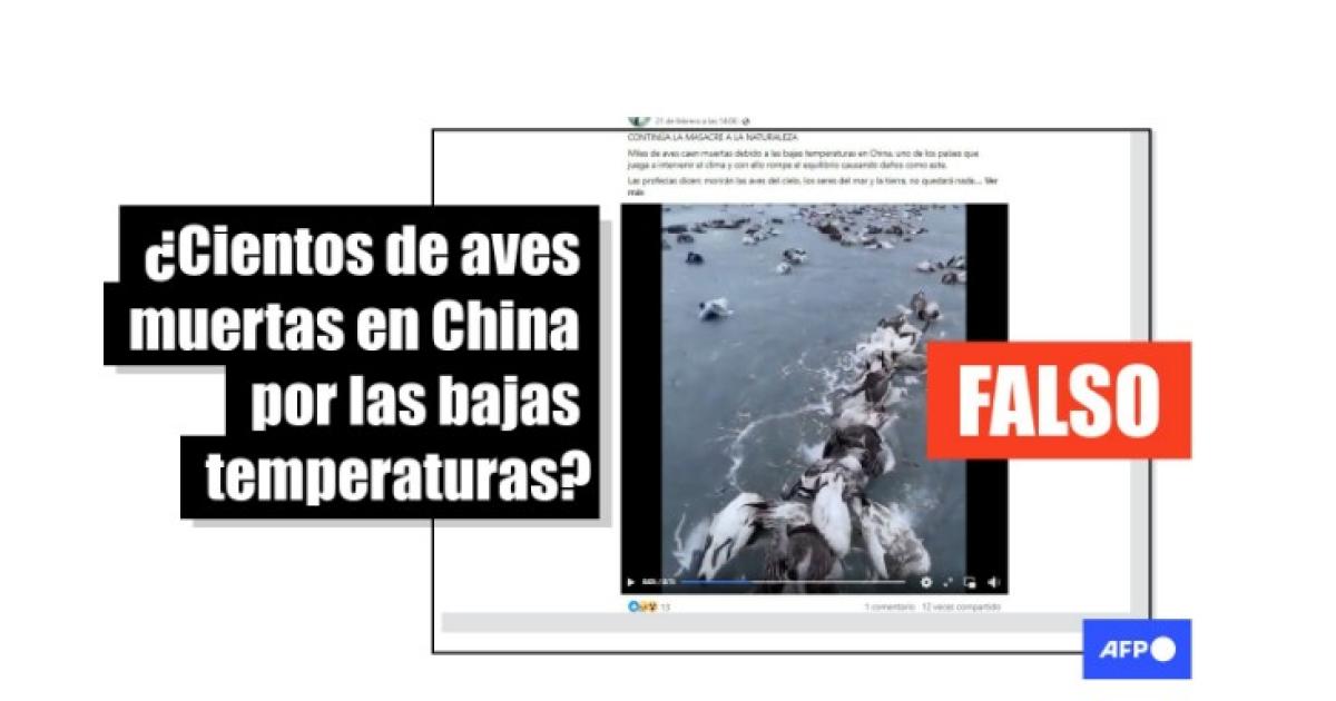 “CONTINÚA LA MASACRE A LA NATURALEZA Miles de aves caen muertas debido a las bajas temperaturas en China, uno de los países que juega a intervenir el clima y con ello rompe el equilibrio causando daños como este”, mencionan publicaciones en Facebook (1, 2) que difunden la secuencia de 15 segundos de duración.