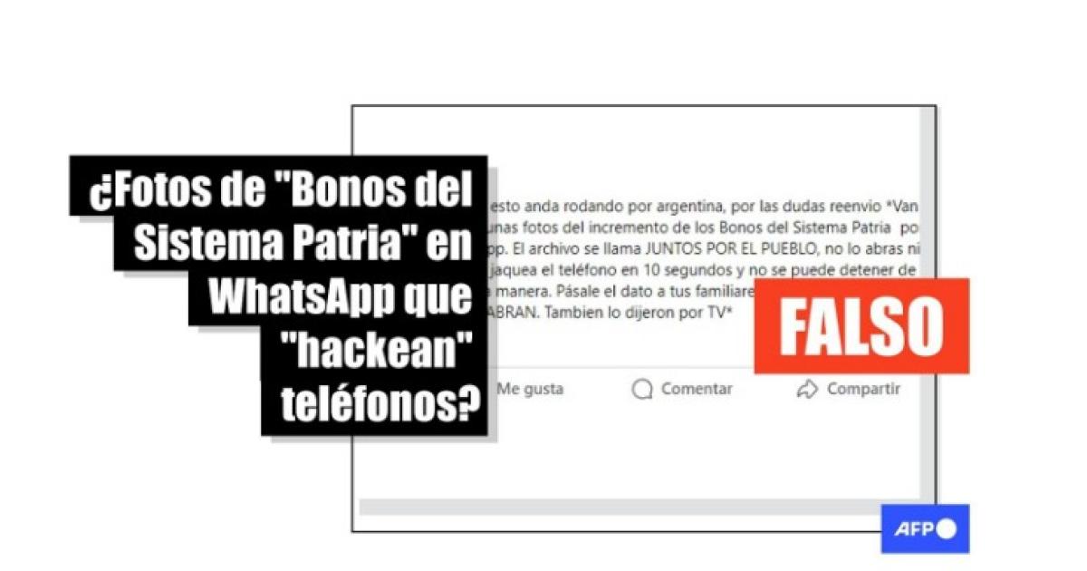 “Van a subir unas fotos del incremento de los Bonos del Sistema Patria por Whatsapp. El archivo se llama JUNTOS POR EL PUEBLO, no lo abras ni veas, te jaquea el teléfono en 10 segundos y no se puede detener de ninguna manera. Pásale el dato a tus familiares y amigos. NO LO ABRAN”, se lee en publicaciones en Facebook y X. Afirmaciones similares han circulado también vinculadas a México y Argentina al menos desde noviembre de 2023.
