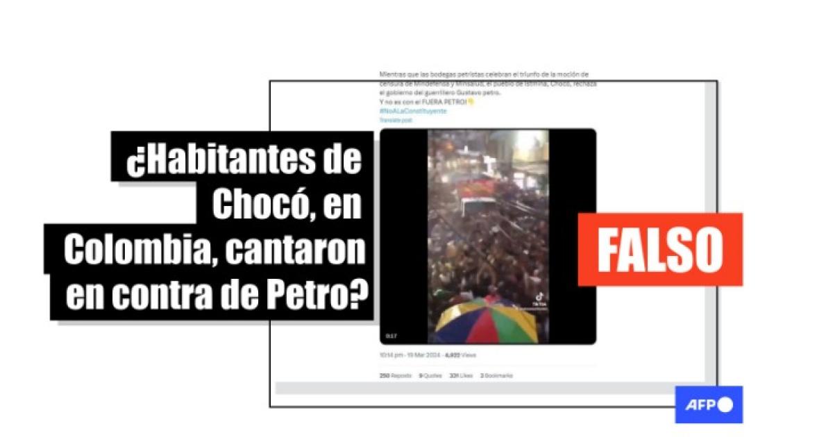 AFP Factual consultó al periodista chocoano Aimar Murillo Mosquera, coordinador de una emisora en esa región, quien confirmó que la secuencia viral en redes muestra un cántico contra los habitantes del municipio vecino de Condoto.