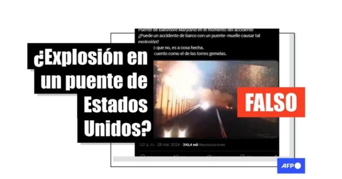 “Puente de Baltimore Maryland en el momento del accidente ¿Puede un accidente de barco con un puente-muelle causar tal explosión? No, claro que no, es a cosa hecha. ,,,,,Otro cuento como el de las torres gemelas”, dicen las publicaciones en Facebook y X, junto a una secuencia que muestra una explosión en un puente.