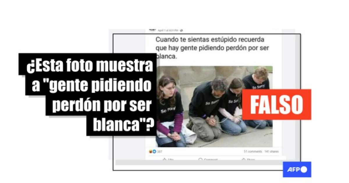 “Cuando te sientas estúpido recuerda que hay gente pidiendo perdón por ser blanca”, dice la leyenda que acompaña la imagen, y que circula con ligeras variaciones en Facebook, X e Instagram desde 2020. Los retratados llevan camisetas en las que se lee “So Sorry” (“muy arrepentido”, en inglés).