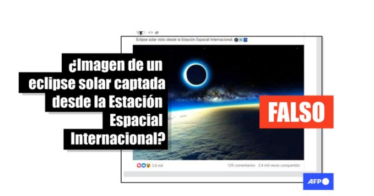 “Eclipse solar visto desde la Estación Espacial Internacional”, aseguran publicaciones en Facebook y X junto con la imagen que exhibe a la Luna ocultando al Sol y a la Tierra de fondo.