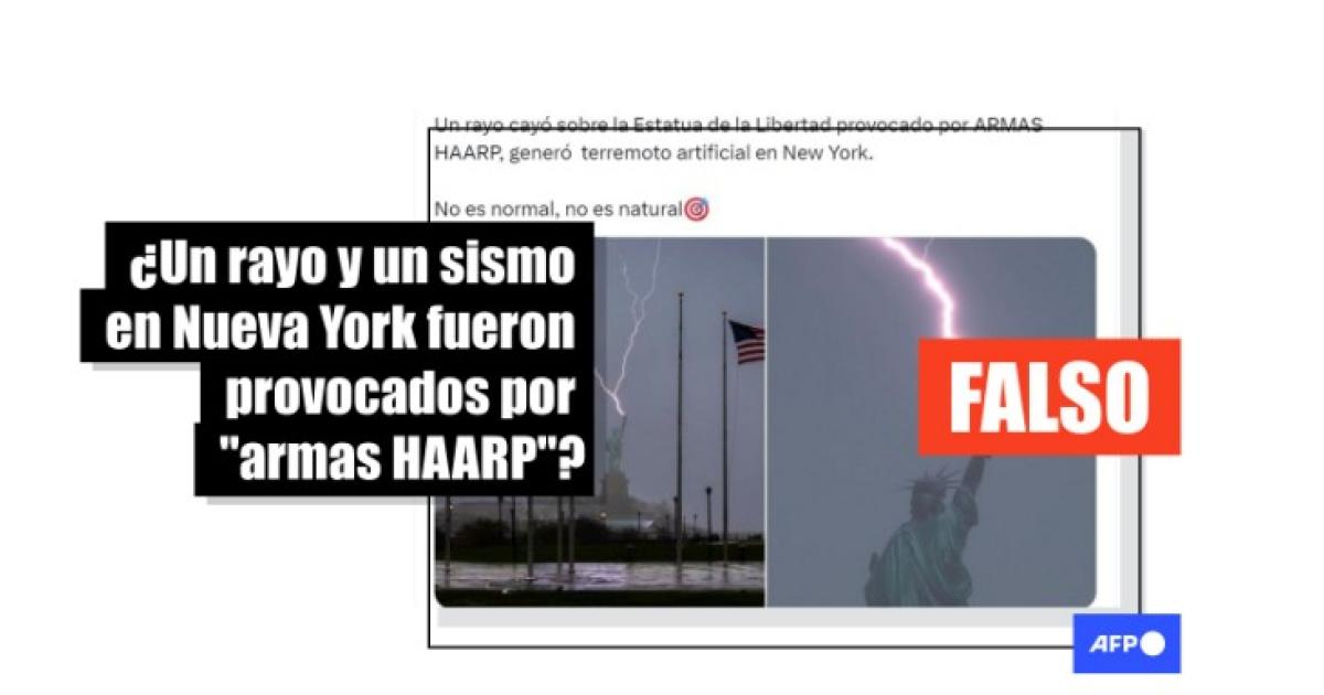 “Un rayo cayó sobre la Estatua de la Libertad provocado por ARMAS HAARP, generó terremoto artificial en New York. No es normal, no es natural”, dicen publicaciones en Facebook (1, 2) y X.
