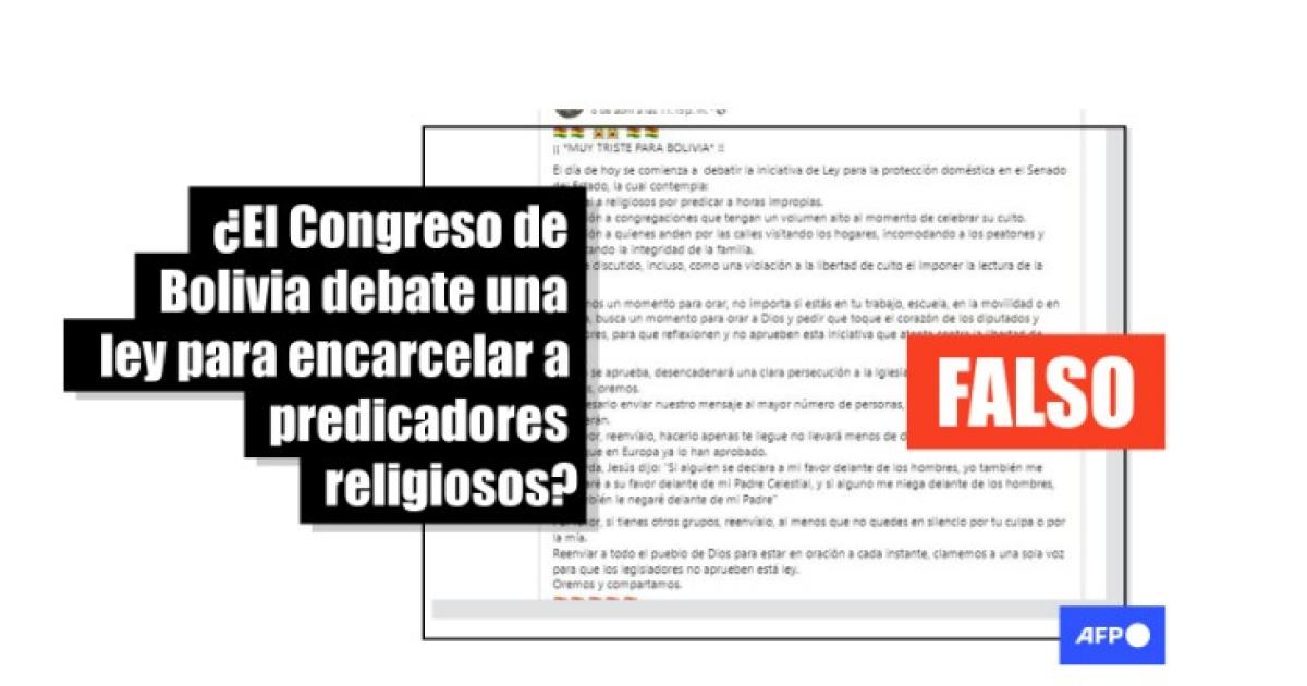 “¡¡ *MUY TRISTE PARA BOLIVIA* !! El día de hoy se comienza a debatir la iniciativa de en el Senado del Estado, la cual contempla: Cárcel a religiosos por predicar a horas impropias”, se lee en uno de los mensajes que circula en Facebook (1, 2, 3).