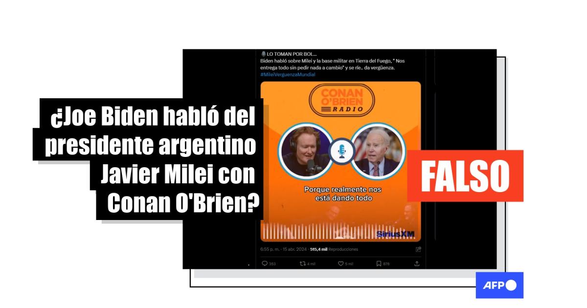 Un diálogo generado con inteligencia artificial entre el presidente estadounidense, Joe Biden, y el presentador y comediante Conan O’Brien ha sido compartido más de 8.500 veces en redes sociales desde mediados de abril de 2024. En él, una voz que emula la de Biden hace referencia al mandatario argentino, Javier Milei, diciendo que está entregando recursos sin pedir nada a cambio, y que Estados Unidos “nunca la había tenido tan fácil”. La única entrevista que O’Brien hizo a Biden data de diciembre de 2023 y no contiene alusiones a Milei.