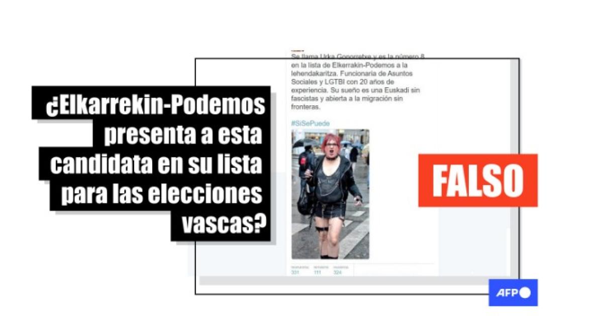 “Se llama Urka Gonorretxe y es la número 8 en la lista de Elkerrakin-Podemos a la lehendakaritza” (la presidencia regional vasca), afirma este mensaje publicado en X con la fotografía de una mujer, que fue compartido en Facebook y que circuló con ligeras variaciones desde otras cuentas. Algunos de los mensajes añaden que la supuesta candidata es “funcionaria de Asuntos Sociales y LGTBI con 20 años de experiencia. Su sueño es una Euskadi sin fascistas y abierta a la migración sin fronteras”.