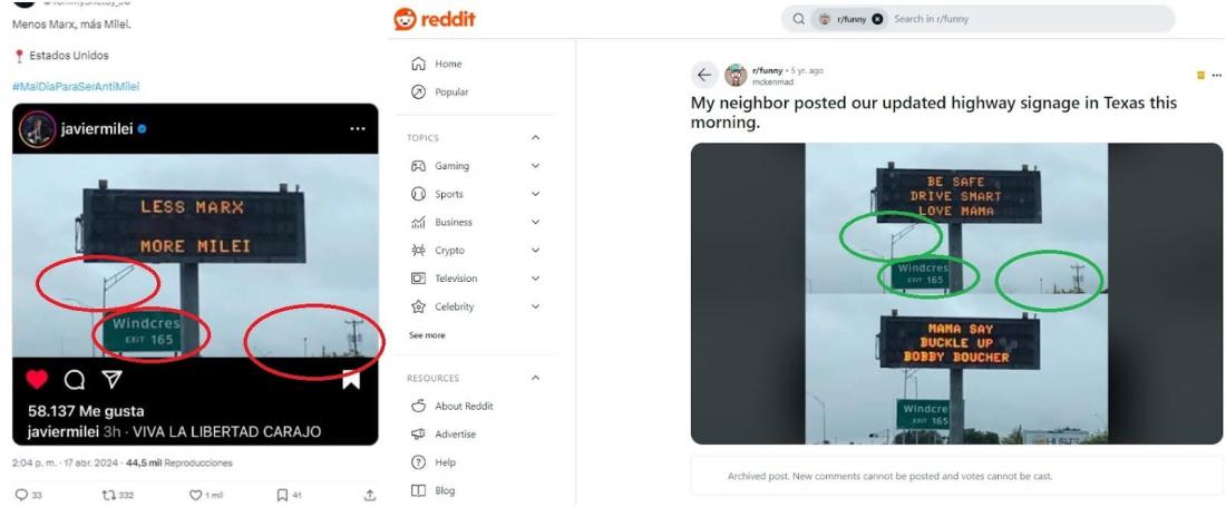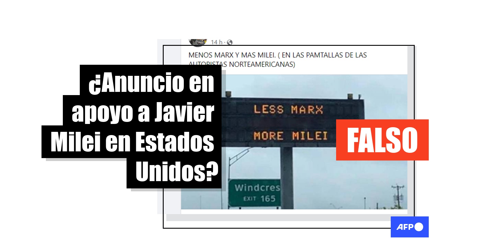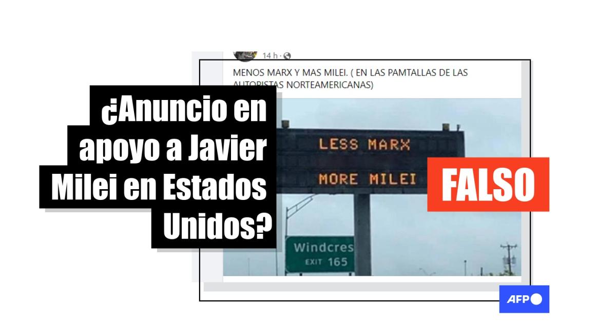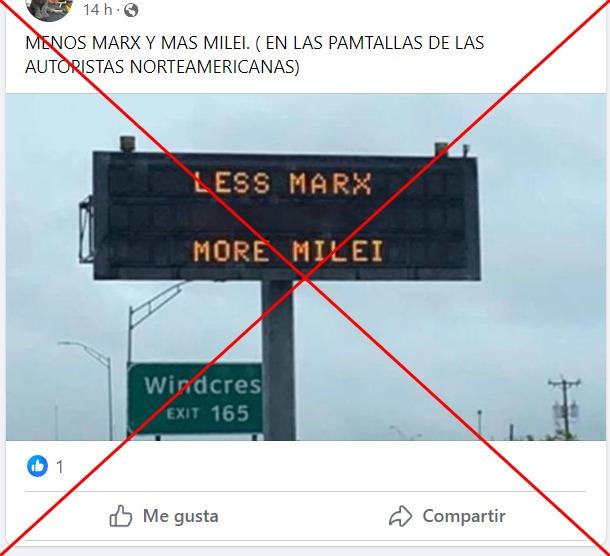 Desde abril de 2024 circula la fotografía de un panel informativo en Estados Unidos que supuestamente dice, en inglés, “Menos Marx, más Milei”, en alusión al autor de El manifiesto comunista y al actual presidente argentino. Más de 1.800 usuarios de redes sociales comparten el anuncio que, en realidad, fue creado en base a una foto de 2019, tomada en Texas. El panel original incluía una campaña de prevención vial.