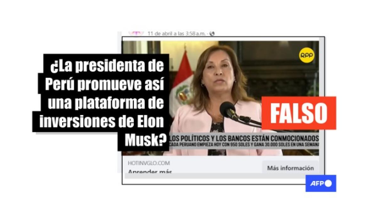 Luego se añade el fragmento de una conferencia de la presidenta peruana en el que brinda un supuesto descargo: “Puedo garantizar personalmente la fiabilidad de esta plataforma de inversión y dar las gracias a Elon Musk”.