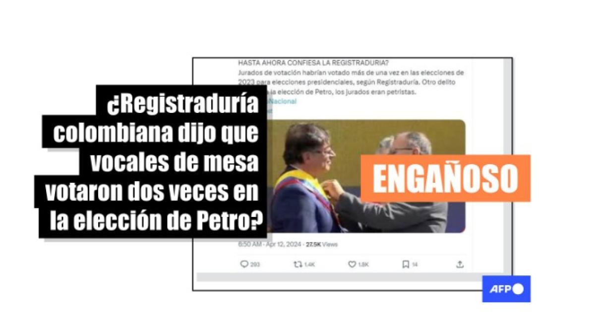 “HASTA AHORA CONFIESA LA REGISTRADURIA? Jurados de votación habrían votado más de una vez en las elecciones de 2023 para elecciones presidenciales, según Registraduría. Otro delito que anula la elección de Petro, los jurados eran petristas. #21AParoNacional”, dice el mensaje en X, difundido también como captura de pantalla en Facebook (1, 2).