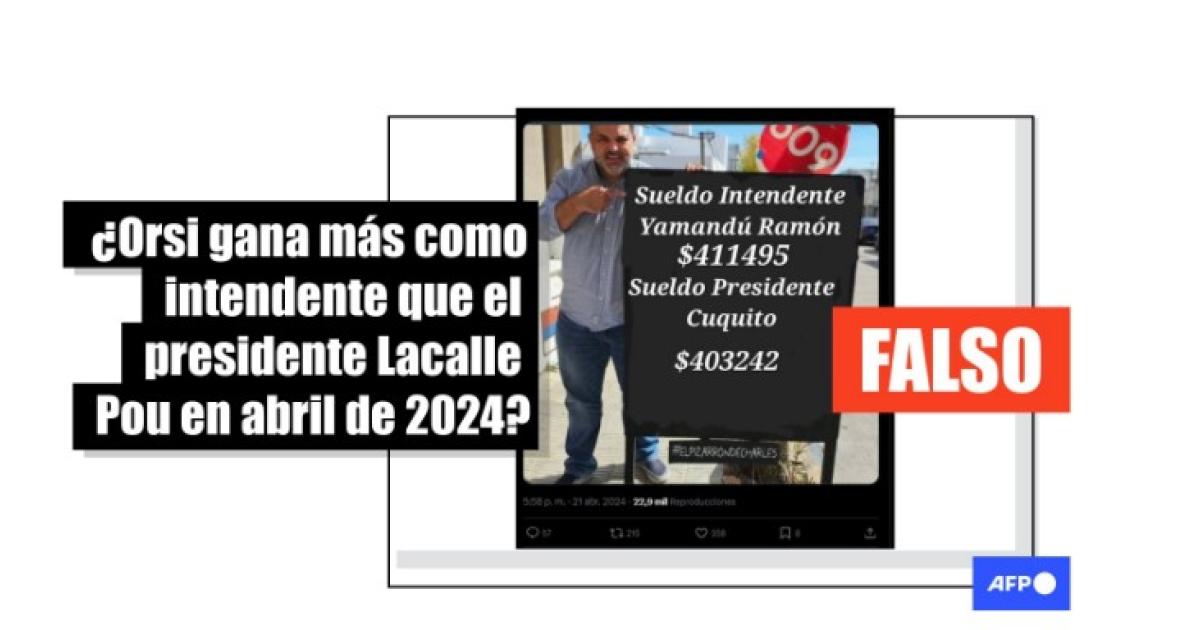 En 2021, cuando circuló desinformación similar sobre el salario de ambos políticos, AFP Factual obtuvo los datos de la remuneración de Orsi a través de funcionarios de la comuna. Al comienzo de su mandato, en 2015, el entonces intendente cobraba 302.372 pesos nominales y en 2020, al finalizarlo, 447.665. Mientras, Lacalle Pou ganaba 669.899 pesos nominales, lo que quedaría en 403.097 líquidos, número similar al que circula en redes.