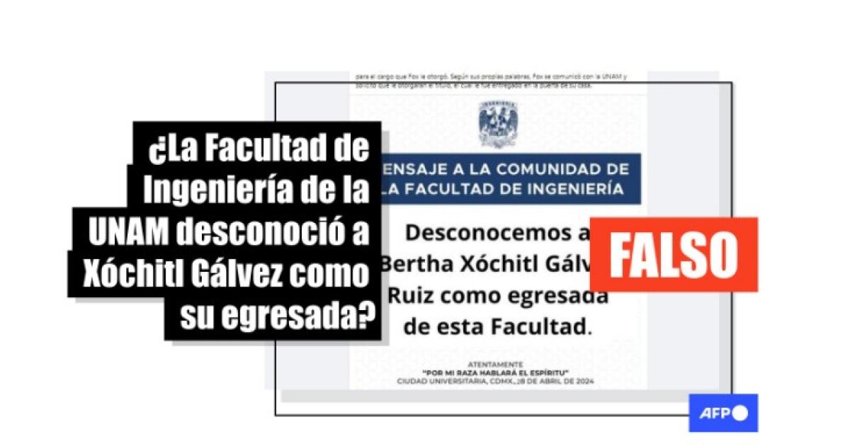 El mensaje, atribuido a la Facultad de Ingeniería de esa universidad y fechado el 28 de abril de 2024, dice: “Desconocemos a Bertha Xóchitl Gálvez Ruiz como egresada de esta Facultad”.