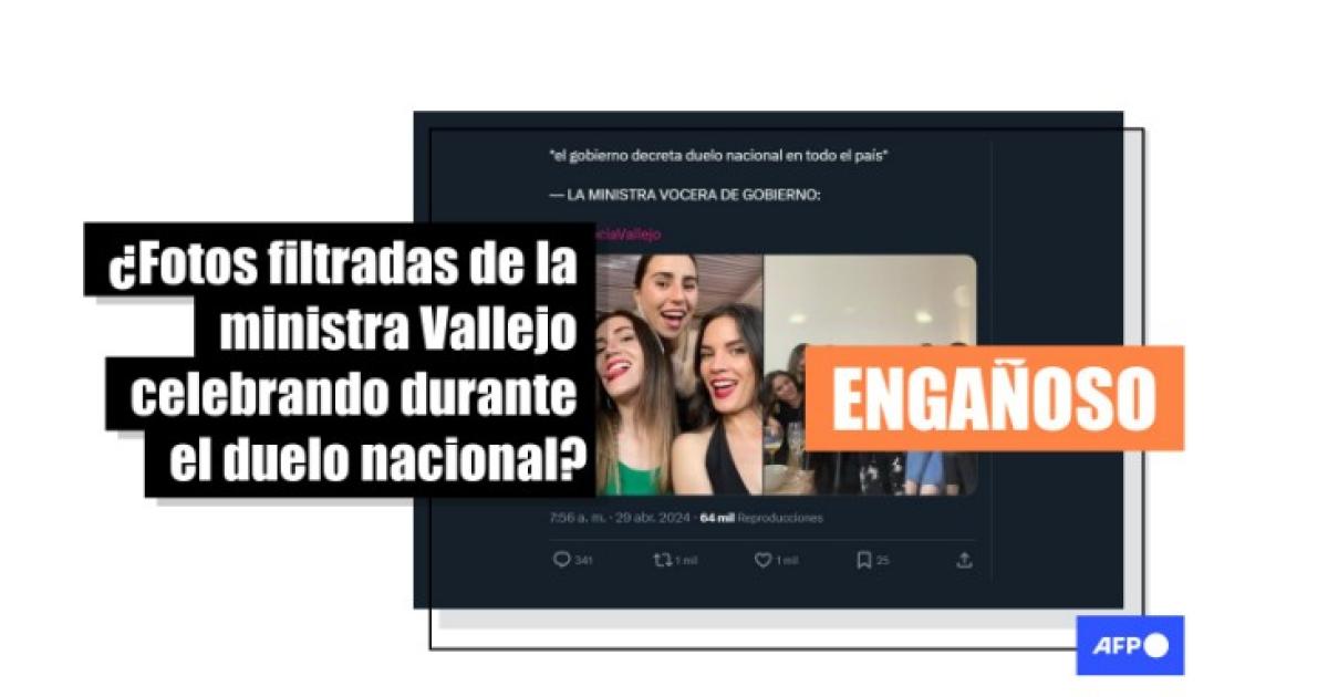 En ese contexto, usuarios en redes sociales comenzaron a compartir las dos imágenes asegurando que muestran a la ministra Vallejo presuntamente durante su celebración de cumpleaños, que es el 28 de abril. Sin embargo, ninguna de las imágenes data de esa fecha.