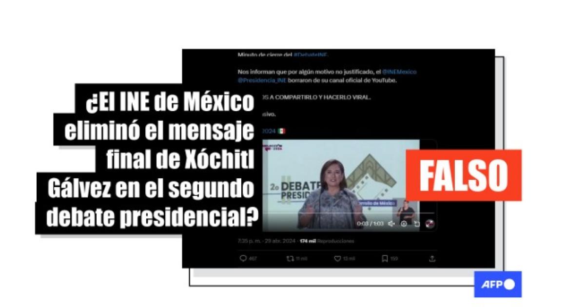 “El INE Mexico eliminó de su canal de Youtube el discurso de cierre de Xochitl Galvez en el segundo debate presidencial, pero dejó intactos los cierres de Claudiashein y AlvarezMaynez”, afirma una publicación en Facebook que incluye la secuencia supuestamente borrada.