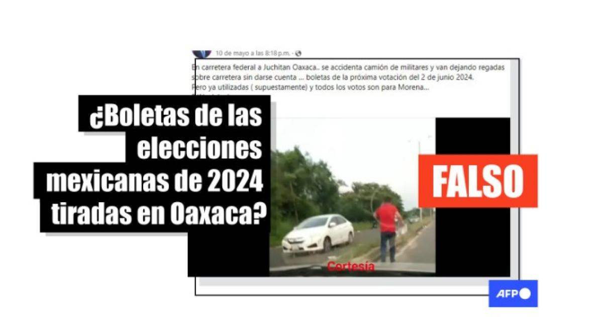 “En carretera federal a Juchitan Oaxaca.. se accidenta camión de militares y van dejando regadas sobre carretera sin darse cuenta … boletas de la próxima votación del 2 de junio 2024”, dicen publicaciones en Facebook (1, 2), X, Instagram y sitios web, junto con la grabación.