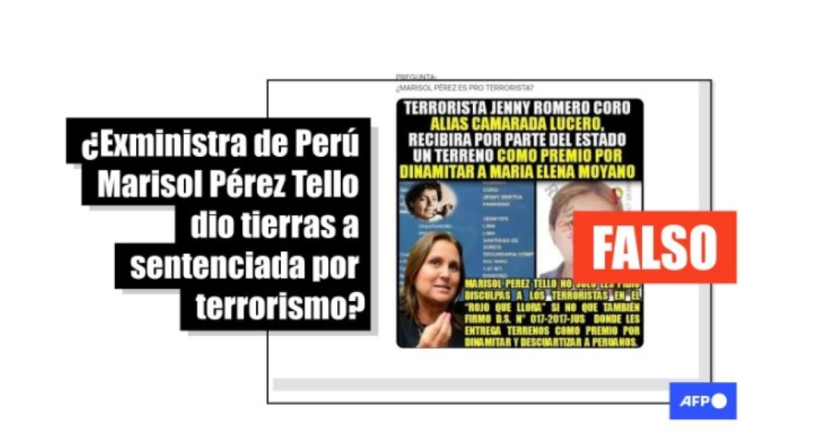 “Terrorista Jenny Romero Coro, alias camarada Lucero, recibirá por parte del Estado un terreno como premio por dinamitar a María Elena Moyano", se lee en una gráfica difundida en Facebook (1, 2) y X. "Marisol Pérez Tello no solo les pidió disculpas a los terroristas (...) sino que también firmó D.S N° 017-2017-JUS donde les entrega terrenos como premio por dinamitar y descuartizar a peruanos”, prosigue el mensaje.