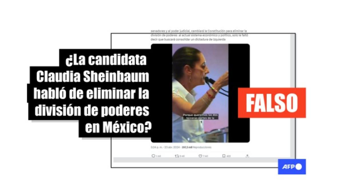 “Claudia aclara que de ganar controlará la cámara de diputados, senadores y al poder judicial, cambiará la Constitución para eliminar la división de poderes al actual sistema económico y político, solo le faltó decir que buscará consolidar un dictadura de izquierda”, dicen las entradas en Facebook y X junto con un video de la candidata en un mitin.
