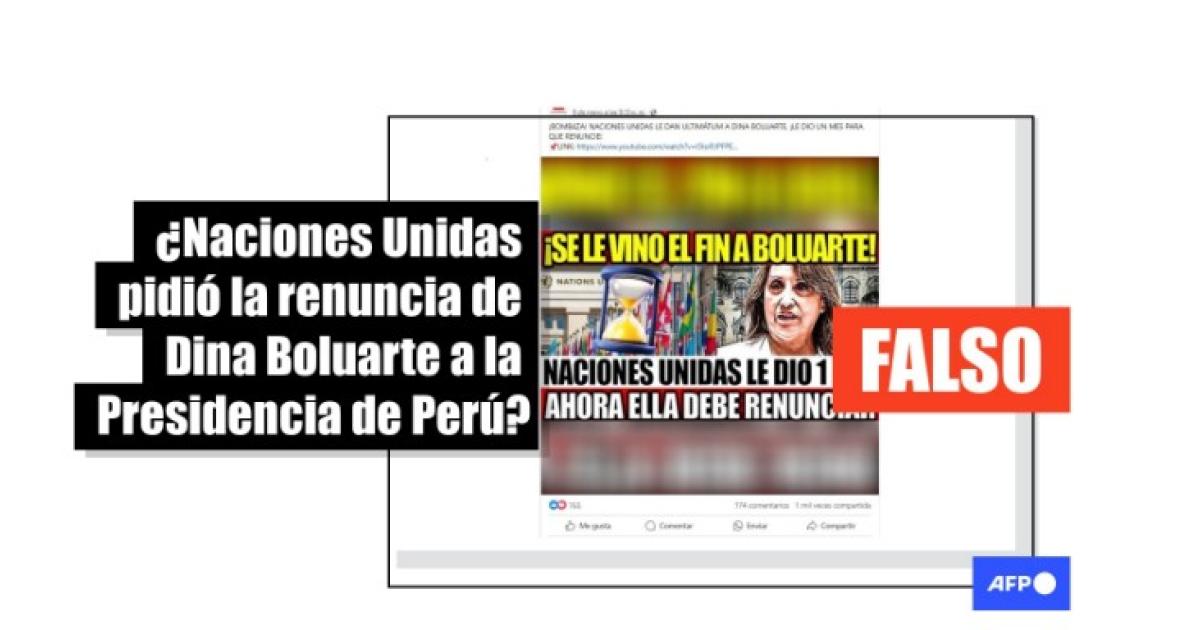 “Naciones Unidas le dan ultimátum a Dina Boluarte, ¡le dio un mes para que renuncie!”, se lee en publicaciones compartidas en Facebook (1, 2) y X.