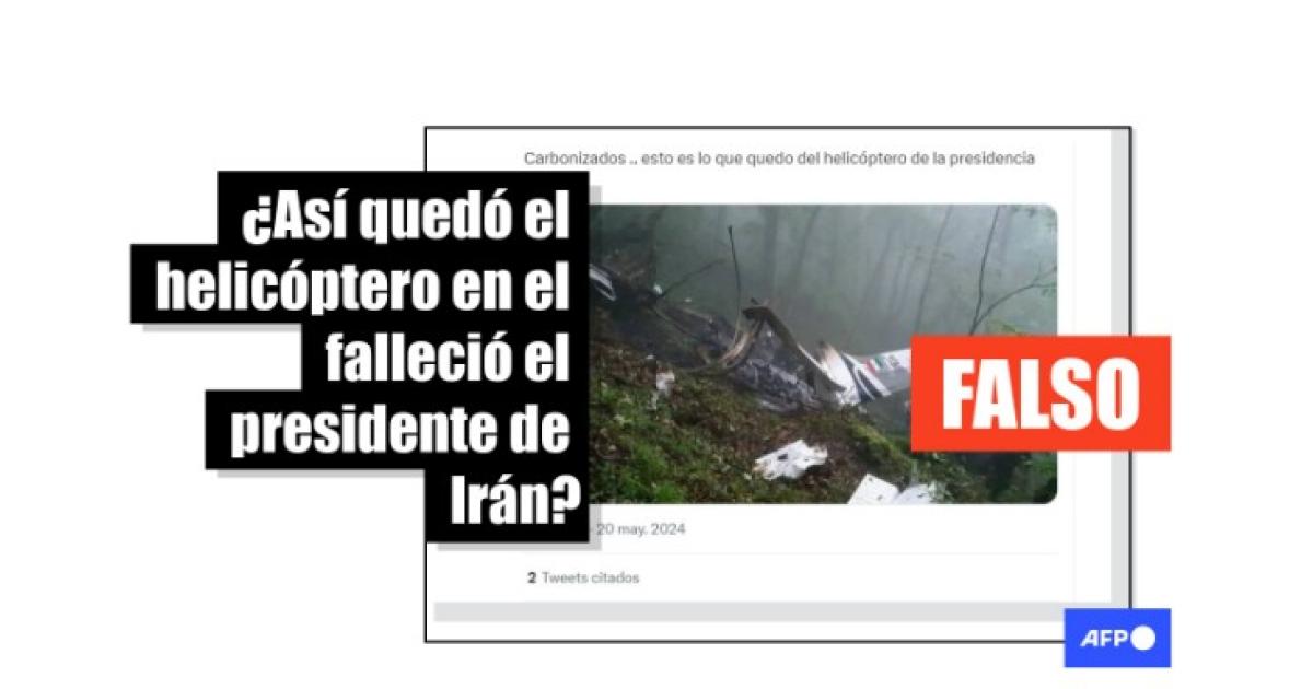 "La muerte de Ebrahim Raisi: así quedó el helicóptero que trasladaba al presidente de Irán", se lee en una de las publicaciones compartidas en Facebook, Instagram y X (1, 2, 3). Varios sitios web también difundieron esta imagen al informar sobre el accidente del helicóptero en el que viajaba Raisi (1, 2)