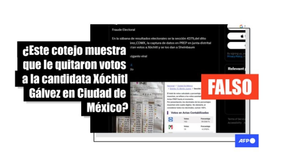 “Fraude electoral. En la sábana de resultados electorales de la sección 4279,del dtto 15, Benito Juárez, CDMX, la captura de datos en PREP en junta distrital federal, le restan votos a Xóchitl y se los dan a Sheinbaum”, dice una publicación en X replicada como captura de pantalla en Facebook (1, 2).