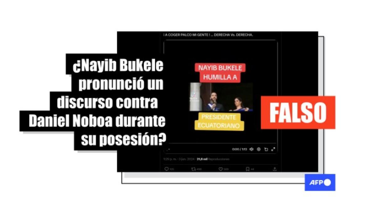 “Nayib Bukele, humilla a Daniel Noboa en su discurso a la nación en El Salvador”, señala una de las publicaciones con un video en X, Facebook (1, 2) y TikTok.