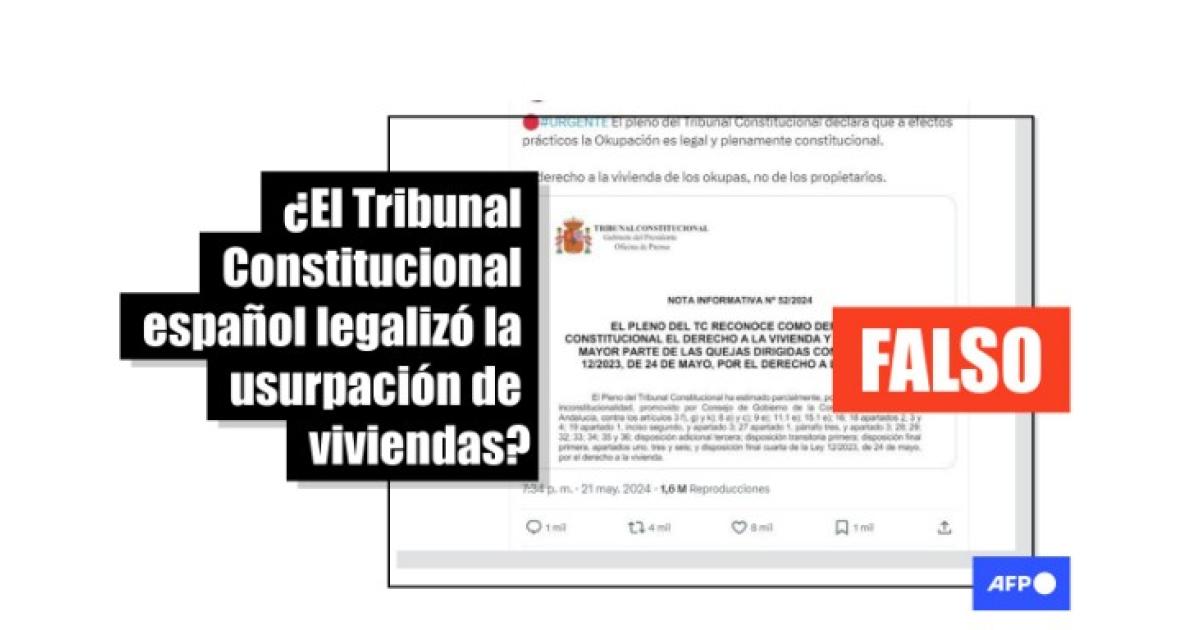 “El pleno del Tribunal Constitucional declara que a efectos prácticos la Okupación es legal y plenamente constitucional”, sentencia un usuario en X, que añade: “El derecho a la vivienda de los okupas, no de los propietarios”. Una captura de pantalla de ese mensaje circuló en Facebook, y otros similares fueron compartidos en Instagram (1, 2), Telegram y TikTok.