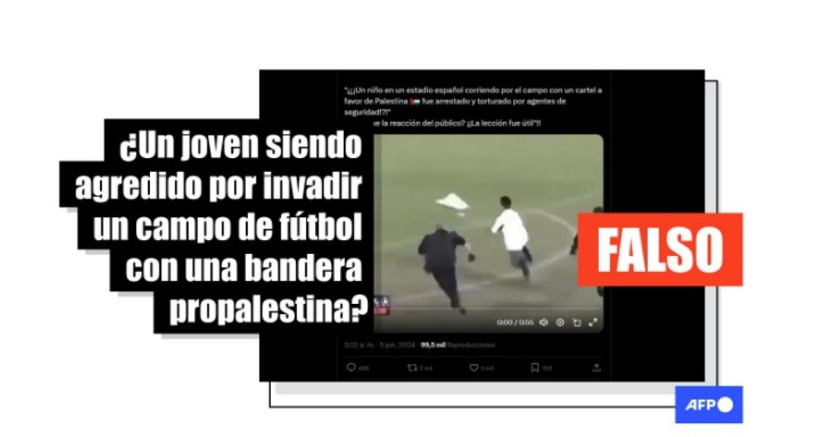 “Un joven ingresó en el campo de juego de un estadio español con una bandera pro Palestina y fue golpeado por cuatro agentes de seguridad. Así reaccionó el público”, señalan publicaciones en Facebook (1, 2) y X (1, 2).