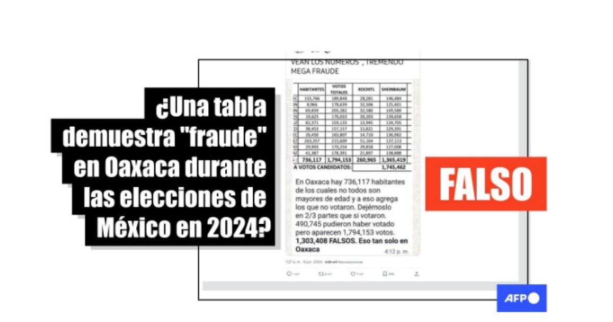 “VEAN LOS NUMEROS , TREMENDO MEGA FRAUDE En Oaxaca hay 736,117 habitantes de los cuales no todos son mayores de edad y a eso agrega los que no votaron. Dejémoslo en 2/3 partes que si votaron. 490,745 pudieron haber votado pero aparecen 1,794,153 votos. 1,303,408 FALSOS. Eso tan solo en Oaxaca”, señalan publicaciones en en X, Facebook (1, 2) e Instagram.